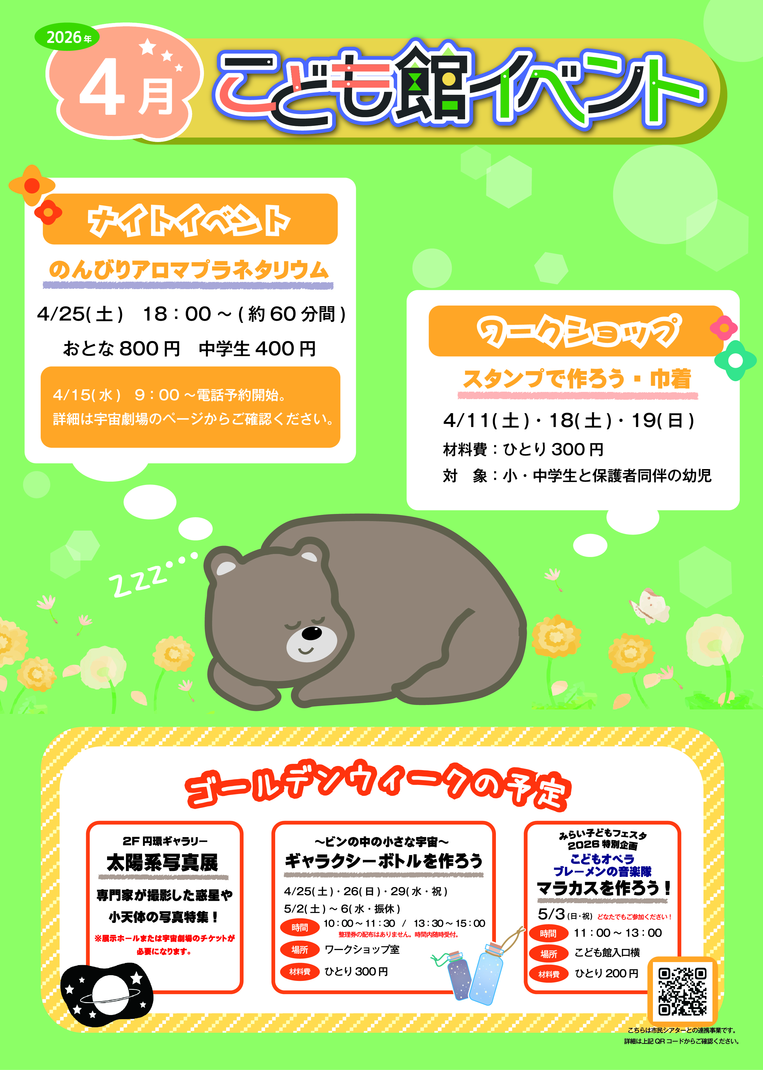 【団体予約について】 【平日の団体利用】 ■2025年6月~2026年3月の団体予約 →2025年5月13日(火)9:00~ 受付中 ■2026年4月・5月の団体予約 →2026年1月15日(木)9:00~ 受付開始 ■2026年6月~2027年3月の団体予約 →2026年5月14日(木)9:00~ 受付開始 【土日・祝日、長期休み期間(春・夏・冬休み)の団体利用】 →事前のご予約をお受けできません。 利用当日に1階インフォメーションでチケットの販売を受付します。 詳しくは、「こども館団体利用のご案内」をご覧ください。 | 【展示ホール 団体利用情報】 (4月10日(金)まではこちらで確認できます) 3月26日(木)~4月5日(日) 春休み期間の為、団体受付なし |