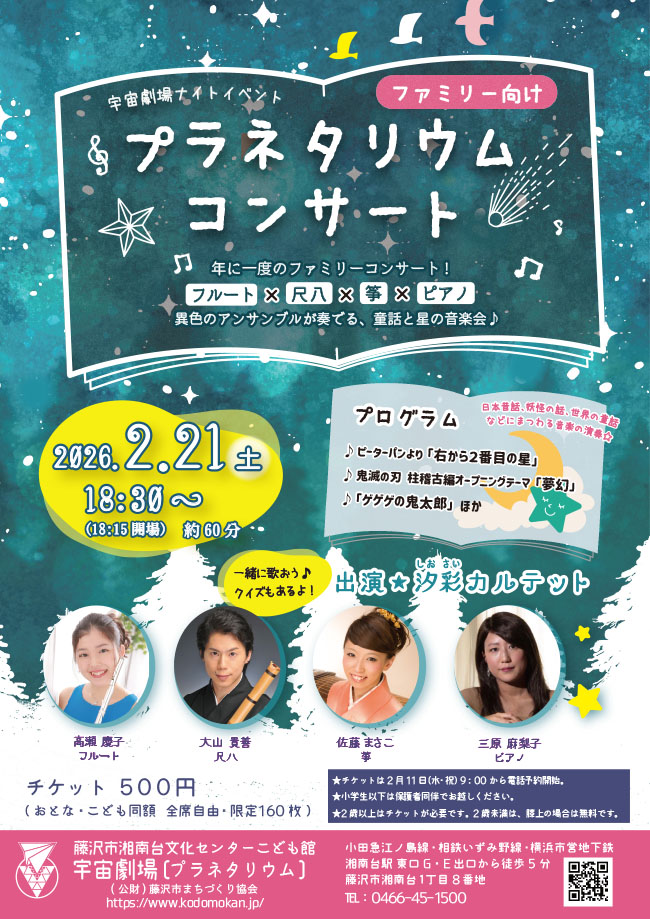 プラネタリウムコンサート ファミリー向け 2026年2月21日(土)18:30~約60分 開場18:15~ →終了いたしました。 年に一度のファミリーコンサート♪ フルート、尺八、筝、ピアノという他には類を見ない アンサンブルでおくる、『童話と星の音楽会』! 一緒に歌ったり、クイズに挑戦してみんなで楽しみましょう☆ ◆出演◆ < 汐彩カルテット > フルート:高瀬 慶子 尺八:大山 貴善 箏:佐藤 まさこ ピアノ:三原 麻梨子 ◆曲目◆ ♪ピーターパンより 「右から2番目の星」 ♪鬼滅の刃 柱稽古編オープニングテーマ 「夢幻」 ♪「ゲゲゲの鬼太郎」 ほか |
